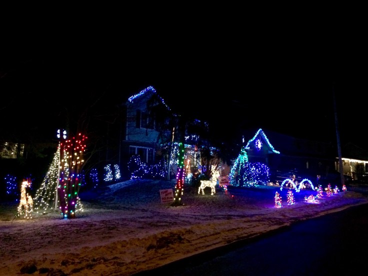 Večer jsem strávila 2 hodiny v autě a vyhlížením těch nejvánočnější domů, co svítí, blikají a hrají na kilometry… a že jich tu je! Vlastně není tu dům, který by nesvítil, neměl jelínky na zahrádce nebo Santu na střeše. Taky platí pravidlo, čím menší domek, tím je Santa větší