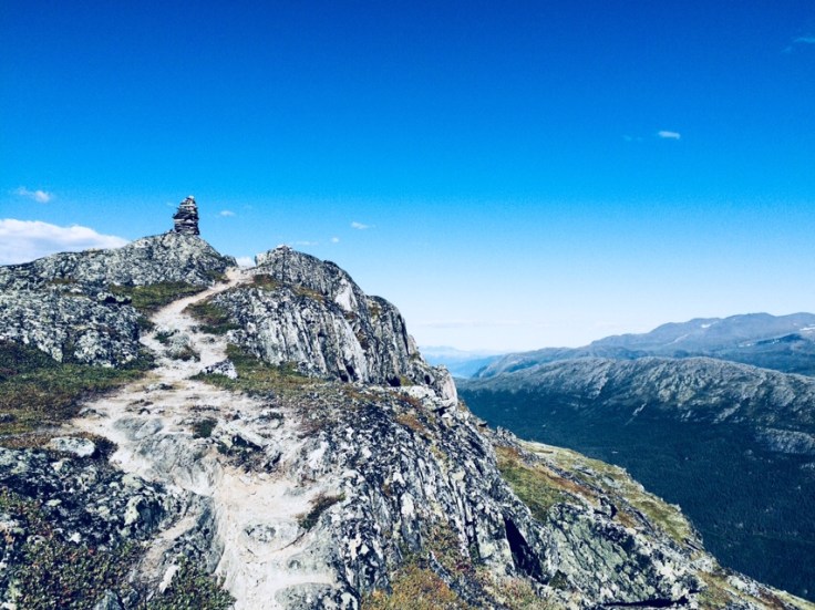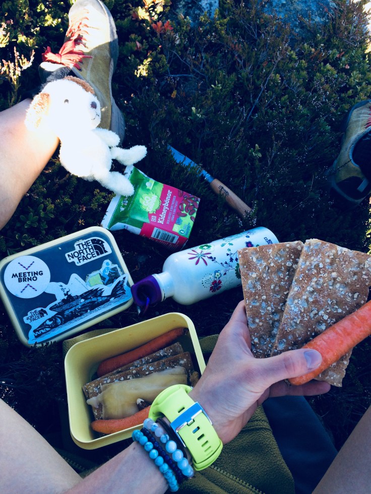 Užívám si nádherný pohled na Lom a zasněženou nejvyšší horu Norska, sním o jejím zdolání. Cestou dolu narazím na trochu vyschlé jezírko, vyjukanou koroptev s mláďaty a pláně s lišejníky. Všechno je na trout suché. Když přece jen vidím potůček, dělám učistu a v závětří chystám piknik, Mňam! (nový druh fazolí Go Green!). Kamzičími stráňemi se vracím ke kolu, zas tam počkalo a nacházím zelenou čepici!
