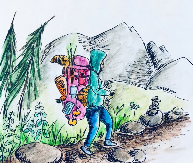 A takhle jsem vypadala, když jsem nakoupila na 3 dny dopředu a vydala se do kopců, luk a skal zdolávat mocné vrcholy. Batoh se mi vymkl kontrole a z lehkých 10 kil už táhnu 16. Funila jsem, funila 🦔