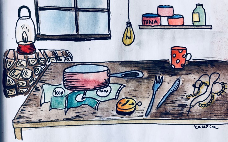 Termoska 260g/hrnek 175g, tričko pruhované? nebo to s horama? ,,to by bylo tematicky. Stačí tahle mikina, nebude pršet. Ponožky stačí asi jedny né?, to vyperu. Jedny šaty se budou určitě hodit, na vábení kamzíků. Ach jo, boty…děsně si chci vzít nový, to přece nemůže vadit, že nejsou rozšláplý… no né? ,,KRÁSO TRP!,, no né nebuď blázen, vem si ty starý,, A sakra červený Kuky 176g, nic jede taky!