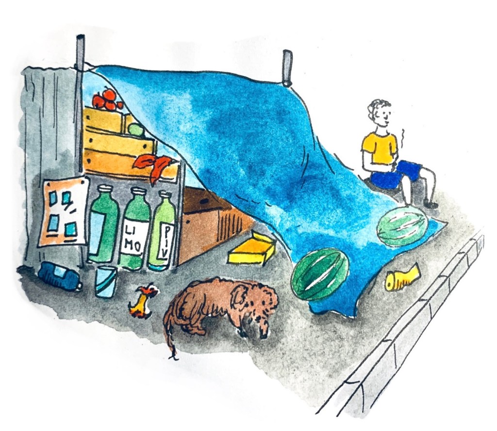Obchody se roztahují do ulic, začínaje rozkutáleným ovocem, bedýnkama se zeleninou a muži posedavajíc s cigárkem. Uvnitř tyčící se hory vyskládané z balíčku sušenek, konzerv, mýdel a balených vod. Zboží se směrem ke stropu vrší všemi směry a na úpatí přepadává do uličky, ta se stává téměř neprůchozí-vyžaduje obezřetnost a čelí nástrahy. Pokladní sedí na pivovým kastlu a se skrývá za regálem žvýkaček, stíracích losů a časopisů. Přes všechno to, se dá v takovém krámu skvěle nakoupit! Proti dešti perfektně slouží modré plachty zatížené vodními melouny. 🍉🍉🍉