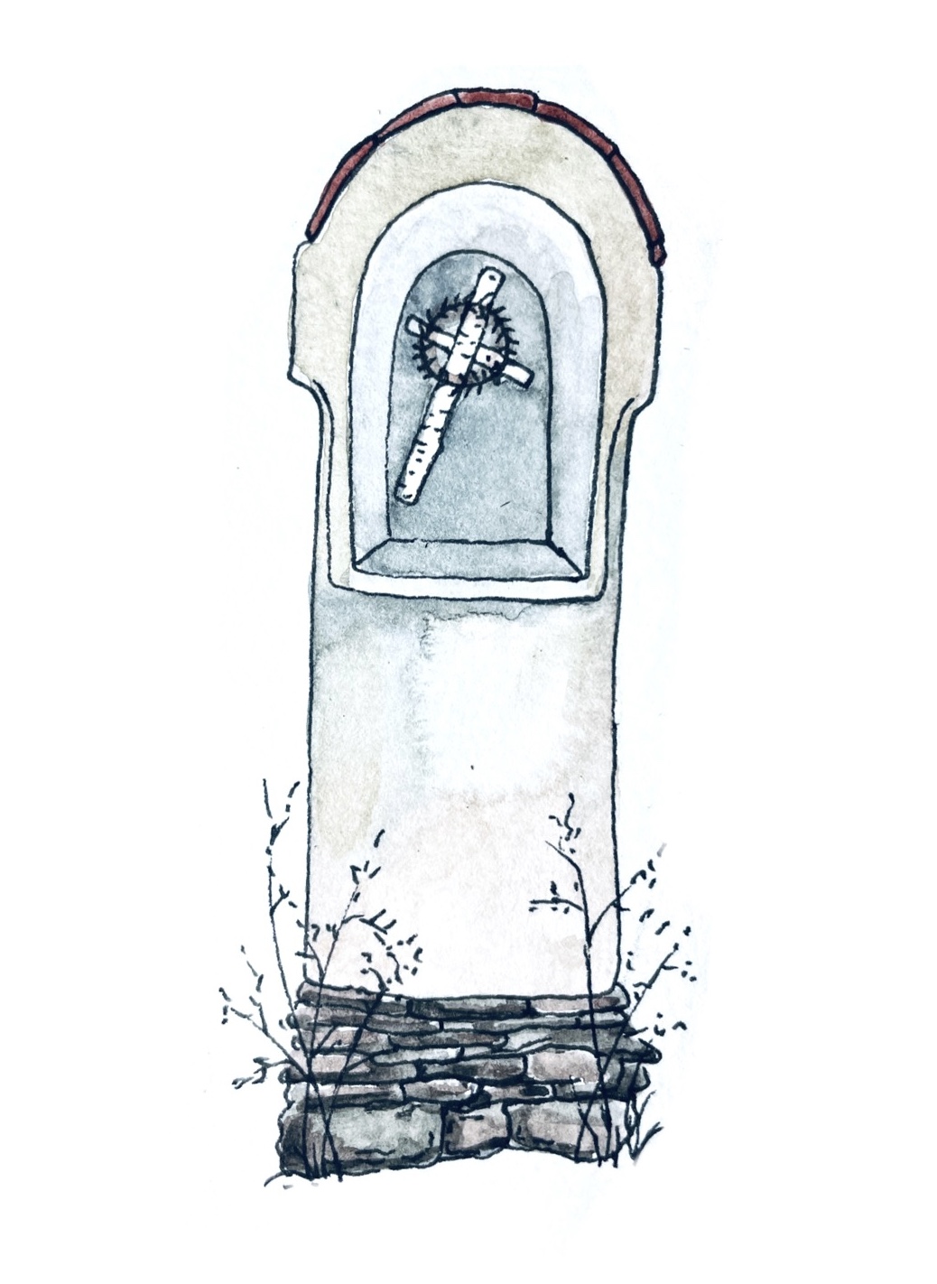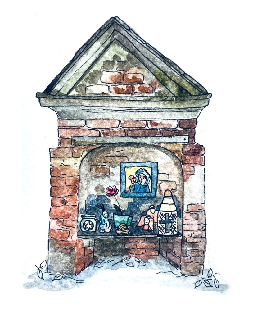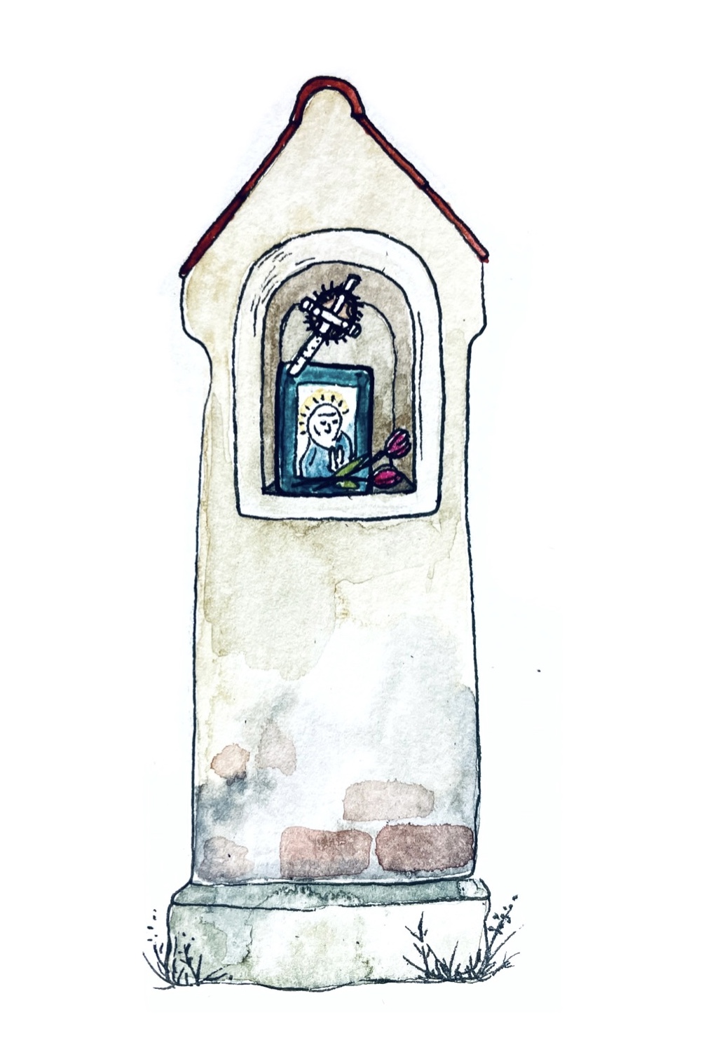 Jeden z mých osobních projektů je cyklus boží muka, který započal v Českém Krumlově, kde jsem byla týden sama na procházkovoilustračním pobytu. Byl leden a já se vydávala na dlouhé výlety po okolí. V tamní krajině mě nadchla zasněžená a opomíjená boží muka. Večer jsem pak podle fotek překreslovala jednotlivé mučky, které jsem na svém okruhu navštívila. Každým dnem jsem výlety zdokonalovala. Trasu jsem plánovala tak, abych navštívila, co nejvíce výklenkových kaplí, ty jsou mé nejoblíbenější. Baví mě pozorovat, co všechno krom platových květin a svíček tu lidé nechali za předměty, mušle, plyšáky, srdíčka, andílci, ulity,… To vše si vymaluji na akvarelový papír.