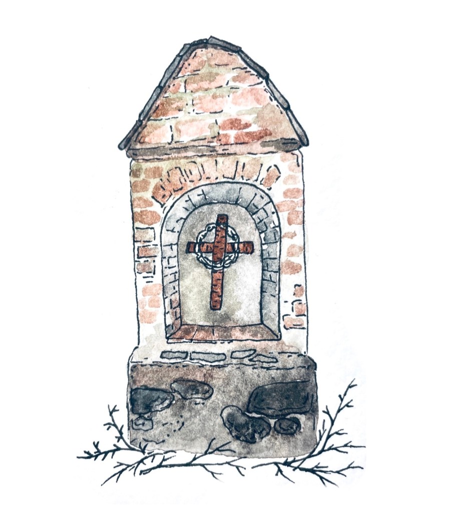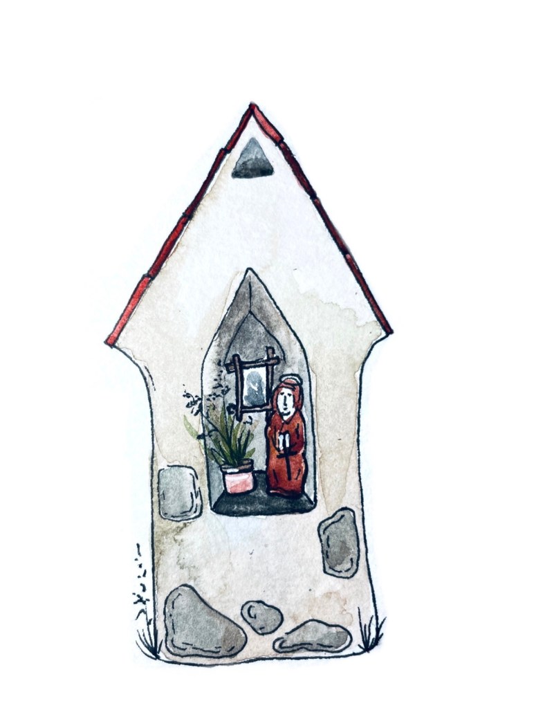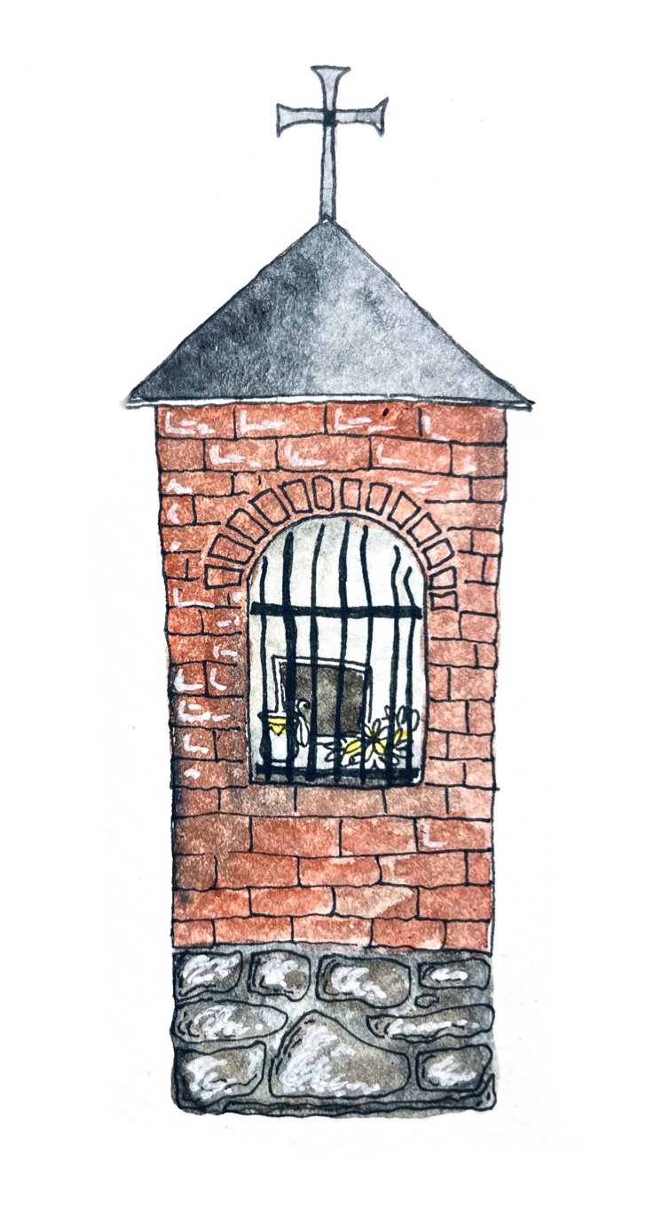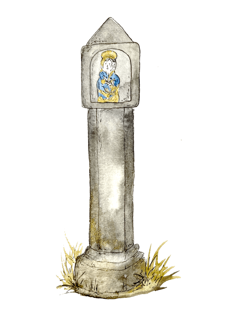 Jeden z mých osobních projektů je cyklus boží muka, který započal v Českém Krumlově, kde jsem byla týden sama na procházkovoilustračním pobytu. Byl leden a já se vydávala na dlouhé výlety po okolí. V tamní krajině mě nadchla zasněžená a opomíjená boží muka. Večer jsem pak podle fotek překreslovala jednotlivé mučky, které jsem na svém okruhu navštívila. Každým dnem jsem výlety zdokonalovala. Trasu jsem plánovala tak, abych navštívila, co nejvíce výklenkových kaplí, ty jsou mé nejoblíbenější. Baví mě pozorovat, co všechno krom platových květin a svíček tu lidé nechali za předměty, mušle, plyšáky, srdíčka, andílci, ulity,… To vše si vymaluji na akvarelový papír.
